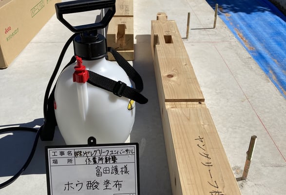 土台伏せの時に、土台・大引きの全面や継ぎ手の部分に散布、また建て方後に面材を貼る前の柱下部に散布します。