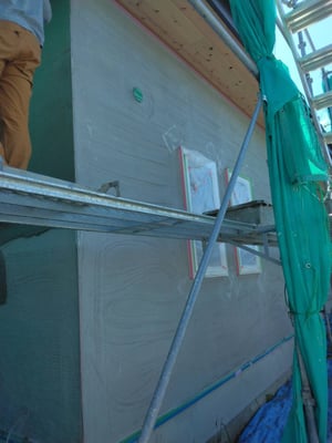 網の上に下塗りをし、その上に仕上げの左官材を塗ります。ラフな感じのコテの模様がついた